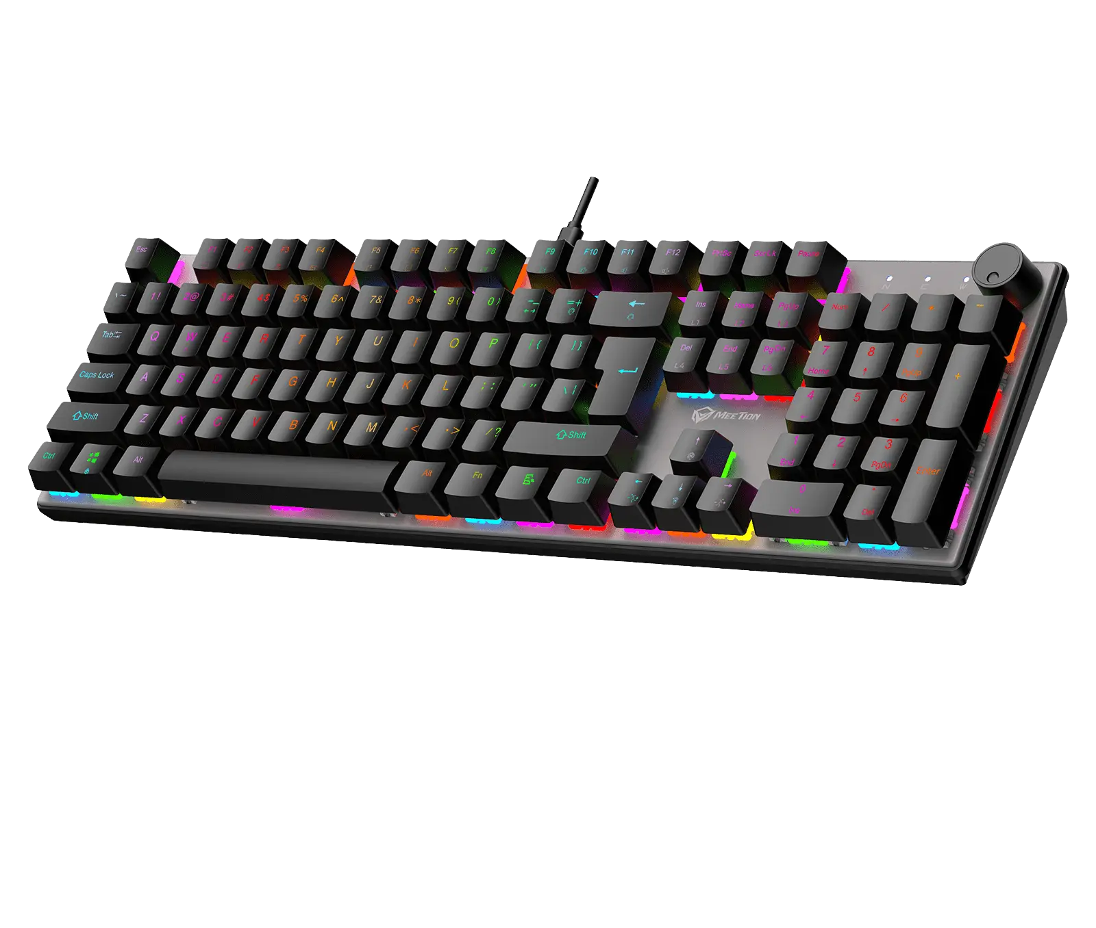 A premium full-size mechanical keyboard with hot-swappable red switches, RGB lighting, metal top panel, and a smooth volume control knob. Designed for gaming and fast typing with full anti-ghosting and durable double-shot keycaps.